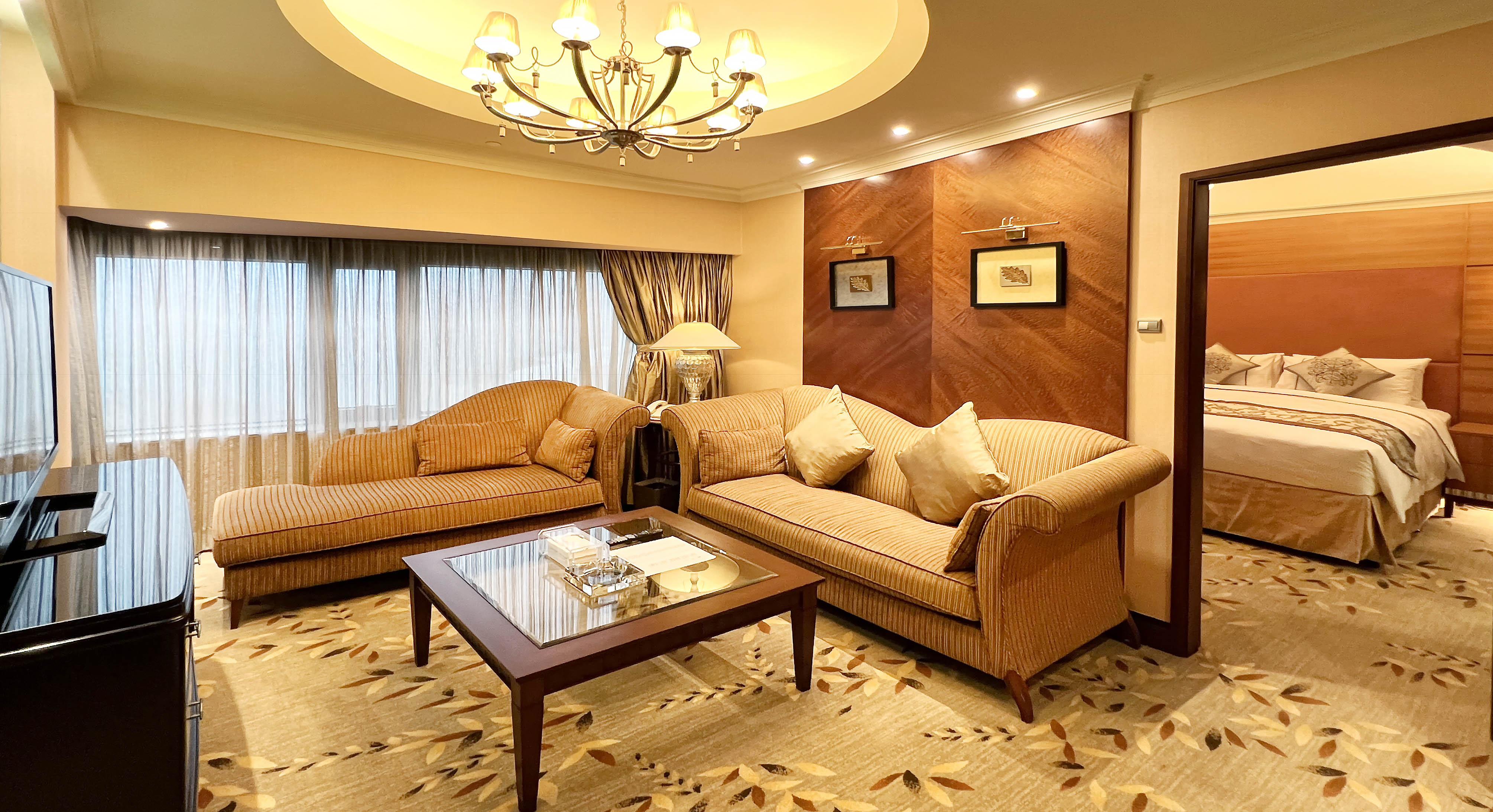 公寓式設計的大使套房,雍容華貴的裝潢,盡顯高貴奢華氣派。寛敞舒適的大廳,有可供六人用饍的餐桌,兩間精緻瑰麗睡房,主臥室更設有獨立寛敞的衣帽間和私人浴室,完美劃分私人領域,提高貴客私隱度。無與倫比的設施配套、寧謐怡人的環境氛圍及專業貼心的客房服務令你流連忘返。另備有「豪華客廳」、「16頭冷熱水噴嘴按摩浴缸」、「2間特大豪華睡房連獨立洗手間」、「自動感應清潔廁板」、「獨立寛敞的衣帽間」、「電動窗簾」。